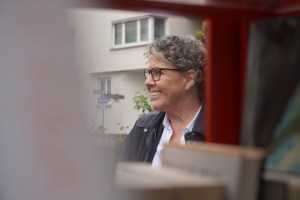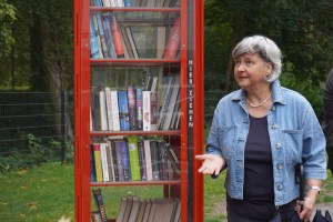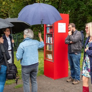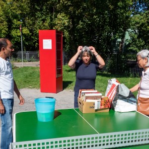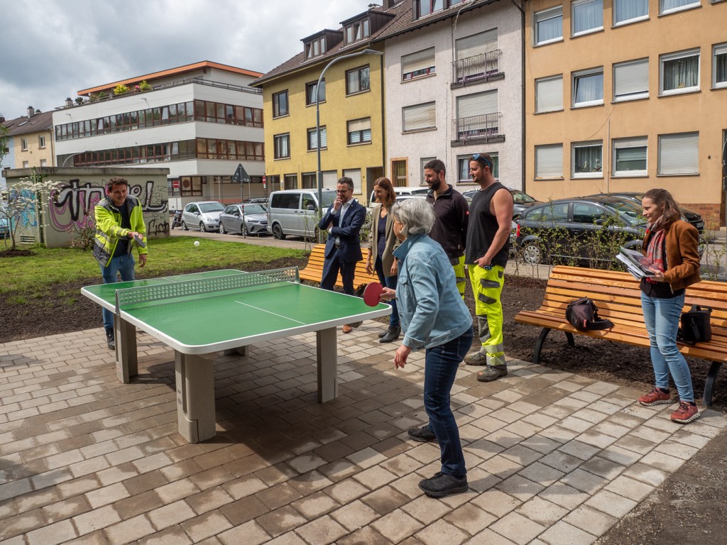 Offizielle Einweihung der Tischtennisplatte an der Kallhardtstraße. Frau Eberth von der Quartiersinitiative spielt mit Herr Schmauderer von den Technischen Diensten der Stadt. Zuschauer sind von rechts: OB Boch, Frau Wacker vom Dezernat Ehrenamt und Bürgerbeteiligung, zwei Mitarbeiter der Technischen Dienste und Frau Bäder vom Planungsamt.Offizielle Einweihung der Tischtennisplatte an der Kallhardtstraße